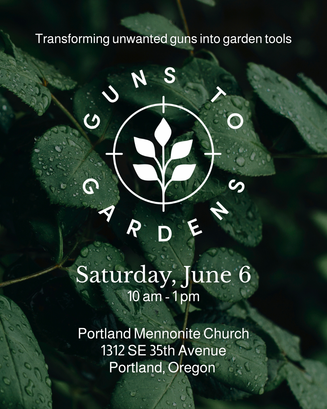 If you would like to contribute to the June 6th, 2026 event, you can donate directly to Portland Mennonite Church. Please include “Guns to Gardens” in the memo line.